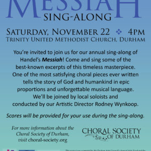 Choral Society of Durham: Messiah Sing-Along You’re invited to join us for our annual sing-along of ... 22 Nov 4:00 pm Trinity United Methodist Church215 N Church St, Durham, NC