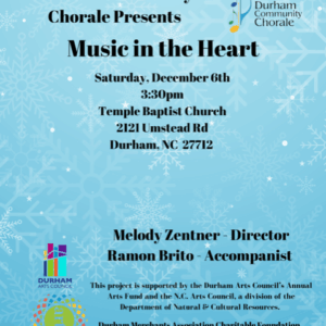 Durham Community Chorale Fall/Holiday Concert: Music in the Heart Join us for an afternoon that will fill your heart ... 06 Dec 3:30 pm Temple Baptist Church2121 Umstead Rd Durham NC 27712