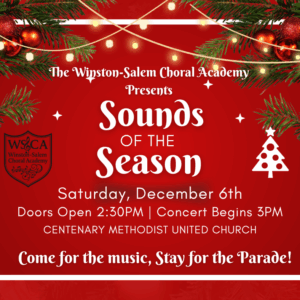 Winston-Salem Choral Academy: Sounds of the Season Holiday Concert Come and get into the holiday spirit with children and ... 06 Dec 3:00 pm Centenary United Methodist Church646 West Fifth Street Winston-Salem, NC 27101