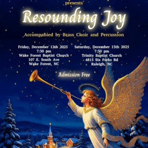 Northeast Piedmont Chorale: Resounding Joy The Northeast Piedmont Chorale is delighted to present its Annual Winter Concert ... 13 Dec 7:30 pm Trinity Baptist Church4815 Six Forks Road, Raleigh