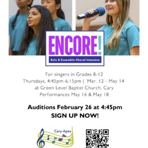 Cary-Apex Youth Choir: ENCORE! Auditions Singers in grades 8-12 are invited to audition for ENCORE! ... 26 Feb 4:45 pm Green Level Baptist Church8509 Green Level Church Rd, Cary, NC 27519