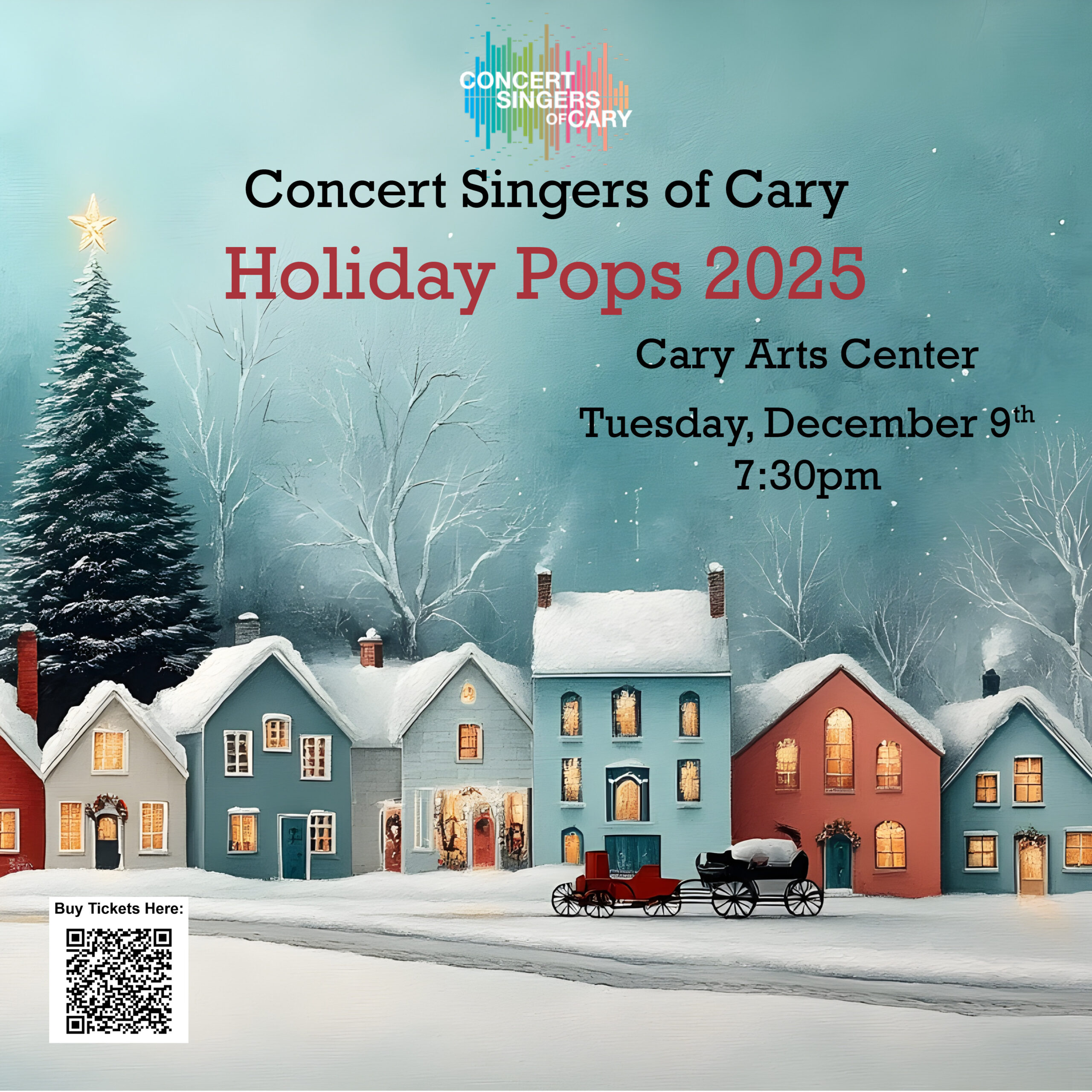 Concert Singers of Cary presents Holiday Pops: Timeless Tidings and Festive Firsts! This beloved annual tradition at the bedecked Cary Arts Center is sure to get you in the holiday spirit. A family-friendly fun program of familiar and new holiday tunes complete with guest artists, this performance will have something for everyone. Come enjoy downtown Cary and spend some time with Concert Singers as we embrace the joy of the holiday season!