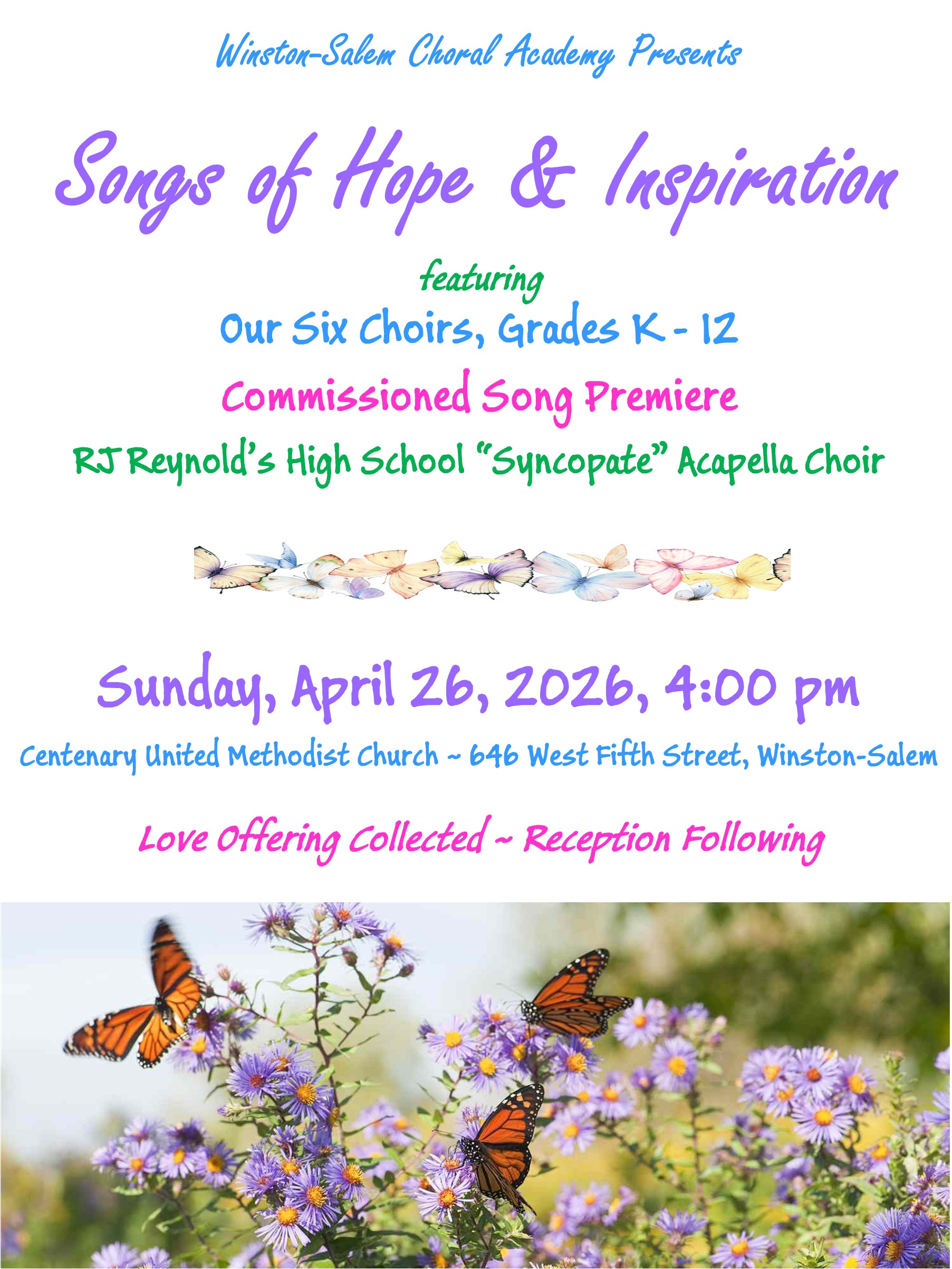 You are invited to attend our annual Spring Concert that will feature multiple choirs with singers from K – 12th grades, premiere a new song, and enjoy the RJ Reynolds High School “Synchopate” Acapella Choir as our guests.